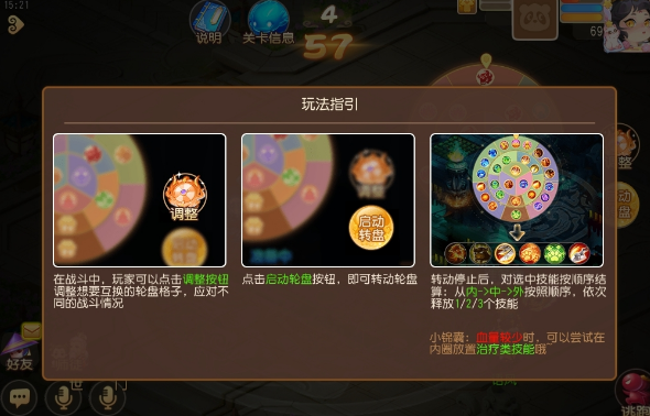 3、战中策略:通过转动轮盘出手技能,轮盘停止后,指向的糖人会按照从内→中→外的顺序依次释放1/2/3个技能;