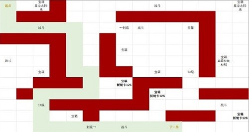 1:如图所示,我们可以看到红色的就是墙壁,白色的区域是可以行走的,宝箱,战斗时间都是需要去拿的,增加我们的探索度