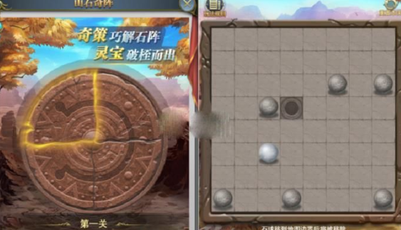 1、山石奇阵共有四关,奇阵中共有1个白色石球及若干黑色石球。通关需要让白球到达特定位置
