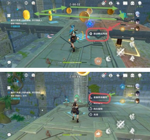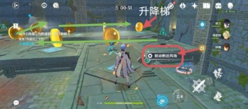 2、上台阶后鼓动附近风场后,按路线转一圈捡完金币到达栏风枢处,点击变换风场方向,拾取上方硬币。