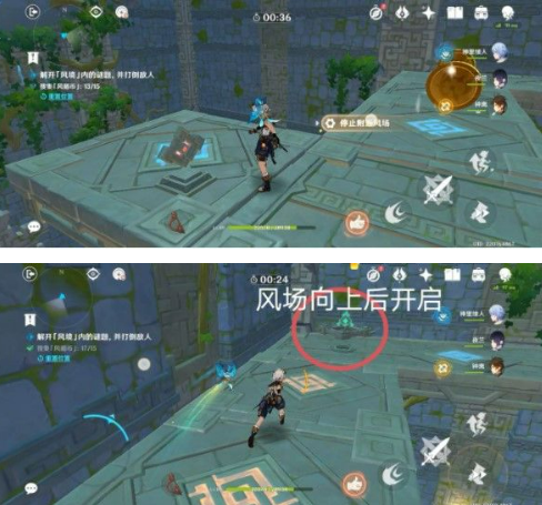 3、到达上方先停止附近风场,转一圈拾取完金币,墙角的一个栏风枢调成风场向上后开启,可拾取完剩余金币,下一个挑战开始。