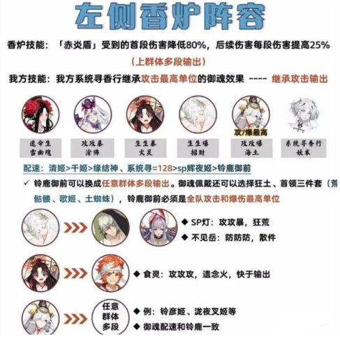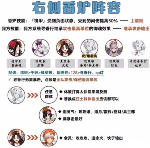 右侧香炉阵容:如果你用寻那么灯狂土;不用寻用其他狂土输出的话灯狂荒即可