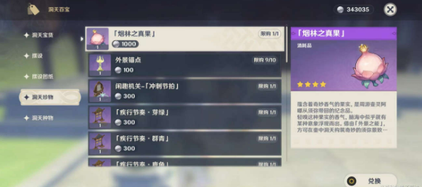 1-首先我们传送到尘歌壶中跟阿圆对话,在冬天珍物选项中购买「烟林之真果」,需要1000洞天宝钱,购买后可以在背包中使用