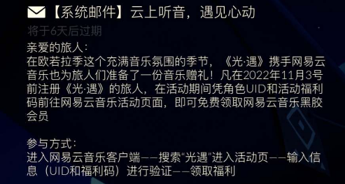 11月3日至11月9日期间,玩家登录游戏,通过右上角【设置-邮件】查看“云上听音,遇见心动”主题邮件,可以获得自己专属的兑换码,将兑换码输入到活动页面即可领取网易云音乐黑胶会员福利。