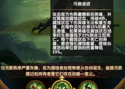 3、技能攻击布阵最靠前的英雄,并为其施加腐蚀状态,效果持续4s,该状态下的英雄无法恢复生命值并且每秒失去25%最大生命值。在腐化状态下阵亡的英雄会强化侵蚀能量,大家要注意血量回复。