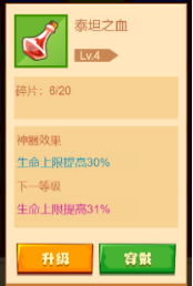 4、由于BOSS的血量厚,攻击力非常高的特性,我们要能够抗的住。首先神器方面的选择是建议大家使用泰坦之血或者银盾。小编这里就选择携带泰坦之血这一件神器,当然大家有更好的神器比如魔方啥的肯定是可以的。