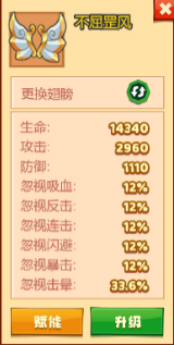 5、至于翅膀和宝石的选择方面,小编所选择的就是克制BOSS第二高的特殊属性击晕,所以小编就选择了忽视击晕的"不屈罡风"翅膀,可以从上图看出翅膀的忽视击晕效果就达到了百分之三十三点六,再加上"盘羊"图纸宝石,小编的宝石镶嵌就差一个就满图纸了,这给小编带来了高达百分之四十的忽视击晕效果,翅膀和宝石两个效果叠加起来就达到了百分之七十多的忽视击晕,可以说抵消了BOSS大部分的战斗力,接下来就硬对硬的打一场就能轻松打过了。