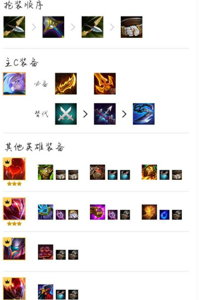 主C艾希最佳装备为羊刀、卢安娜的飓风、锐利之刃,必备羊刀。石头人带肉装,亚索和船长带剩余的物理装。