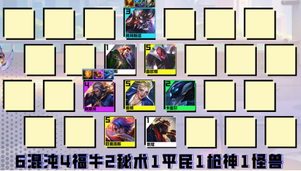 2、阵容羁绊:6混沌4福牛2秘术1平民1枪神1怪兽