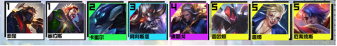 1、阵容构成:泰隆、塞拉斯、卡密尔、阿利斯塔、佛耶戈、蕾欧娜、迦娜、厄斐琉斯、费德提克(9人口)