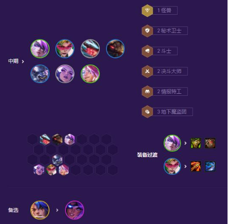 装备方面优先做出狂徒反甲过渡优先级选择2斗士3魔盗2情报;