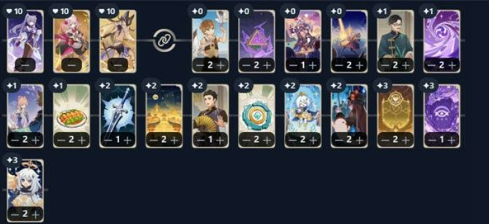 2、事件牌,支援牌,场地牌为立本,元素共鸣·交织之水*2,骑士团图书馆,群玉阁,元素共鸣·粉碎之冰*2,运筹帷幄*2,白垩之术,莲花酥,蒙德土豆饼,唤雷的头冠,璃月港口*2,田铁嘴,便携营养袋,最好的伙伴!*2,星天之兆,仙跳墙,噬星魔鸦,祭礼剑,风鹰剑,如雷的盛怒,派蒙,吐纳真定,护法之誓*2。