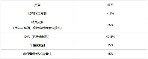 注:可前往官网查看【精选皮肤随机宝箱】,【精选姿态随机宝箱】,【精选个性化物品随机宝箱】详细概率。