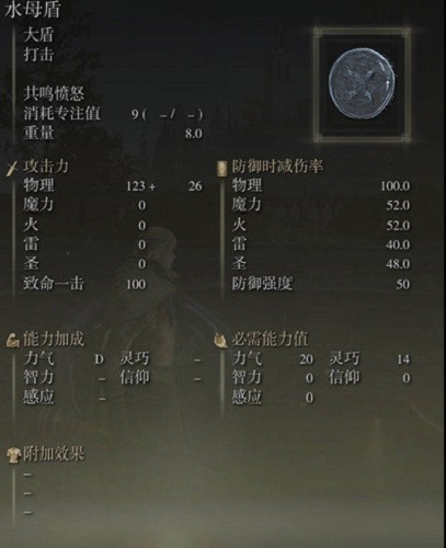 1:水母盾,算是标准的大盾了,百分百的物理防御,这个盾的颜值还是可以的,用战技的时候还会变色有水母的意思,盾牌需要二十点力量和十四点灵巧;