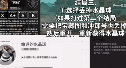 条件2、选择丢弃水晶球,如果打通结局二,那么需要把藏宝图和冲锋号角都丢弃后重开,重新获取水晶球。