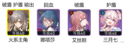 火主+娜塔莎+艾丝妲+三月七的组合用来打这个周本非常好用,队伍中艾丝妲和火主都可以用来破盾,但火主的主要用处还是给自己增加抗性和吸引怪的注意力,娜塔莎和三月七的作用也是为了保证全队的生存,毕竟活着才有输出嘛。