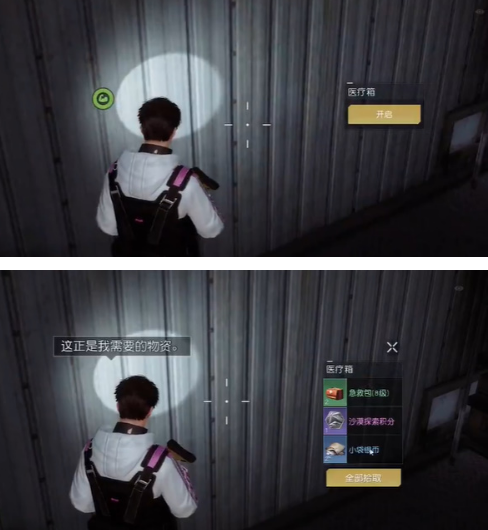 2,看到这个箱子后,查看并打开这个医疗箱,可以获得急救包8级x2、小袋银币x2、沙漠探索积分x1,这边车匪聚落第一个宝箱找到。
