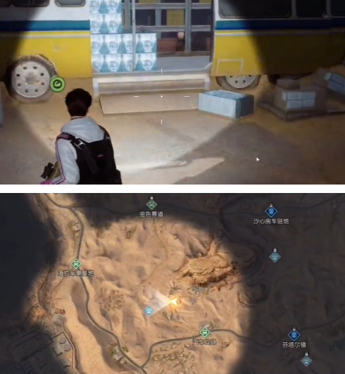 1,看到图中这个面包客车的位置,再根据地图上宝箱所在的位置【6205,-778】绕过这个客车,前往前面第一个集装箱的角落,可以找到这个宝箱。