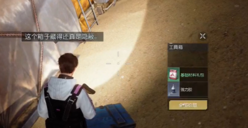 2,移动到中间的位置可以看到这个半埋在土里的工具箱,打开可以获得基础材料包x1、强力胶x2、小袋银币x2、沙漠探索积分x1,到这边车匪聚落三个宝箱就都找完了。