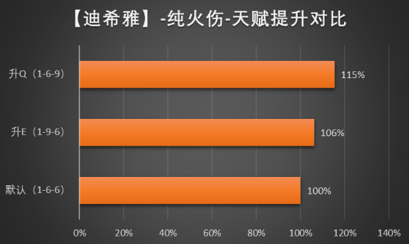 图片解析:以天赋1-6-6为基准100%,分别升级E、Q各3级对比伤害提升幅度,提升分别为Q(115%)>E(106%)。