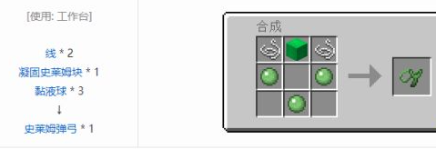 制作史莱姆弹弓需要2根线、1个凝固史莱姆块和3个粘液球