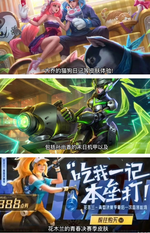 包括大乔猫狗日记、孙尚香末日机甲、花木兰青春决赛等。