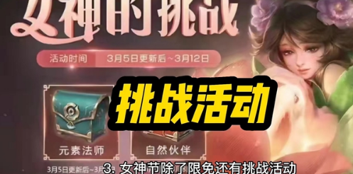 3、女神挑战活动,获取元素法师和自然伙伴奖励,活动时间:3月5日-3月12日。