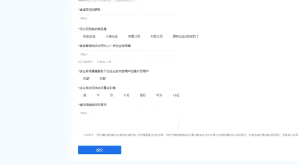 2、打开这个地址后就会提示用户输入姓名、电话、邮箱、公司名称、公司网站、职务、业务场景以及详细的需求描述,同时还需要进行选择公司类型、使用业务场景以及日均访问量级别等信息,最后还需要同意百度的授权,再点击提交即可。