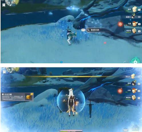 开启宝箱的条件时触摸剑柄,将会调出2冰法师,推荐使用火元素角色快速破盾,如香菱,避免被击落到水中。
