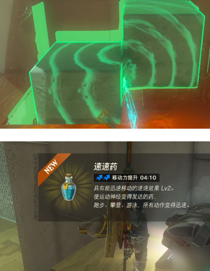 5、将方块放置到下图位置,然后爬上去,在顶部我们可以找到一个宝箱,打开后获得【速速药】。
