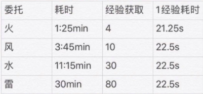 各个委托的耗时如下图所示,如雷委托一次需要30min,那么1小时之后就会有两个格子被占用(不收取的话),而如果20个格子被占满小纸人就会停止工作。因此推荐选择耗时更长的委托,这样不需要频繁的收取。