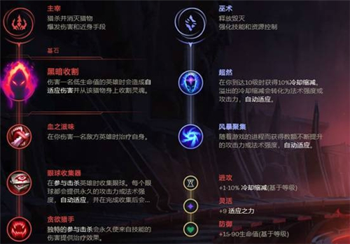黑暗收割对生命值低于一半的敌人造成伤害后触发,血之滋味和贪欲猎手的双吸血效果来增加作战续航,眼球收集器增加适应力,超然在无限火力中会将溢出的冷却缩减变成适应力加成,风暴聚集滚雪球式增加伤害。