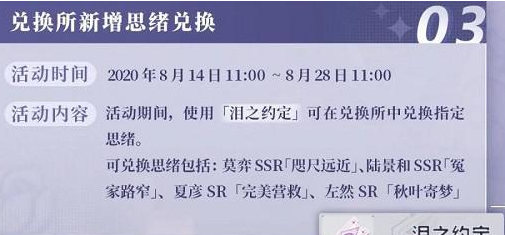 活动期间,兑换所新增莫弈SSR咫尺远近、陆景和SSR冤家路窄、夏彦SR完美营救、左然SR秋叶寄梦。