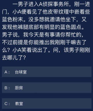 一男子进入A侦探事务所,刚一进门,小A便看见了他皮带纹理中嵌着些蓝色粉末。没多想就邀请他坐下,又发现他裤腿底部有明显的蓝色圆点。男子说,我今天是有事请你帮忙的,不过前提是你能推出我刚刚干嘛去了么?小A笑着说出了。问,该男子刚刚去哪儿了?