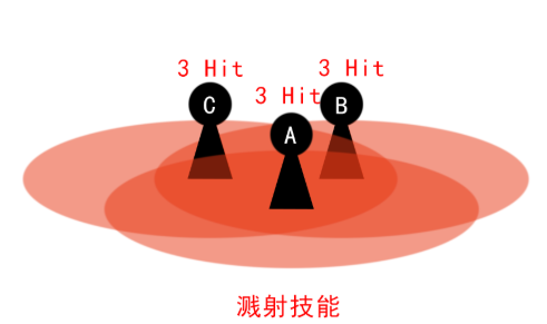溅射机制本身的作用过程如下:在一次技能范围判断中,范围内的每个敌人都会对范围内所有敌人造成一次溅射伤害。具体可以参考下图。由于溅射技能同时命中ABC,ABC同时对周围敌人产生一次伤害判定,最终每个角色都受到三次伤害。