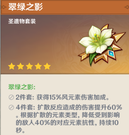 温迪的输出方面只需要穿上翠绿之影4件套减少对应抗性,用武器、主词条为元素精通的圣遗物杯子稍微堆一下元素精通,就可以依靠大招转化属性后的溅射对扎堆出现的小型敌人造成恐怖的伤害。