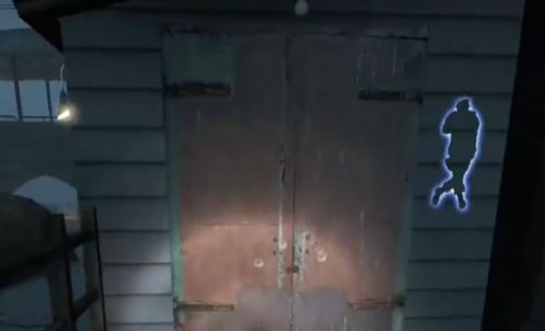 2、围着房子周围转悠你会发现这样一个门,打起来的声音反馈明显和地图上其他物体不一样,所以用近战一直打,打烂为止。