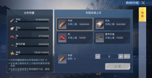 仓库募集,只需要木头/石头/草木纤维/肉。