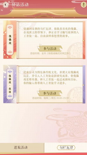 夜场傀儡戏模式中,戏班主(即创建房间的房主)可以选择剧本,剧本由遇见逆水寒的剧情故事衍生,人工智能小灵会自行判定目标是否成功达成。