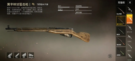 莫辛纳甘是一把经典的栓动狙击枪,使用的是7.62mm子弹,可以装配高倍镜,具有射程远、单发伤害高的特点,并且会在海岛、雪地地图中刷新。