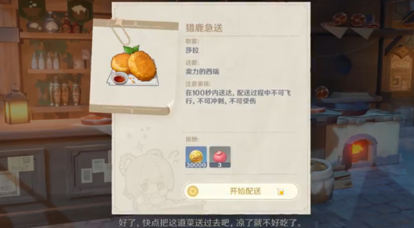 首先来到蒙德城莎拉这里接取送餐任务,接取任务后一定要记住不要使用冲刺和飞行,否则直接失败。