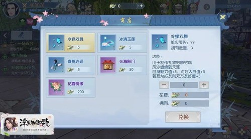 当玩家进入花谷后,可以使用司苑女史赠送的花铲采集鲜花,每次采集鲜花都会使花铲减少,采集每一朵鲜花获得的花材数量不等。而采集鲜花所得到的花材,可以在司苑女史处兑换自制鲜花素材和场景鲜花。若将鲜花赠予他人,还可增加自身魅力值、对方人气值,互为好友还能增加友好度。