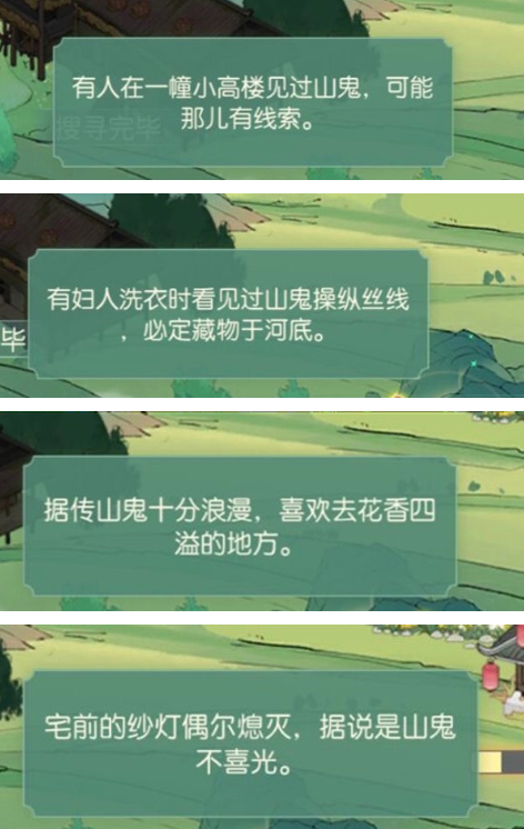 搜寻随机4个小屋达到100%后,可以得到四条线索,然后通过这四条线索分析出山鬼所在,搜寻达到100%后可得到木匣。