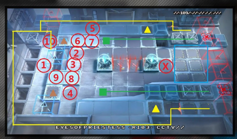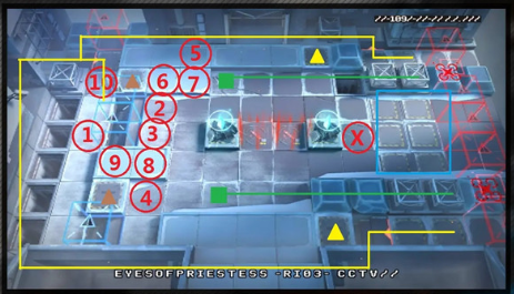 200开始分批次出冰炸弹无人机,两个一组走绿色路线,会在两个绿方块处停留较长时间。300开始出盾兵。中后期蓝色方块内经常会囤兵,但站位后都是一个一个出击的。370两个棕色三角位置的地板翻面成冰块。最后阶段右侧会出一排大盾接一排红冰刀,并且连出两波冰炸弹无人机。