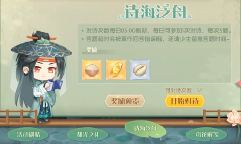 活动说明:江南春光明媚,少主跟随西湖莼菜羹等一行文人们游湖踏青,吟诗作对。规定时间内答对的题数越多,获得的奖励越丰厚喔。