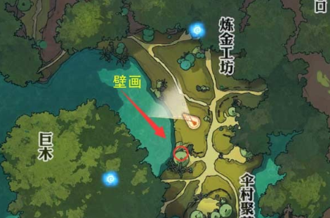 1、首先是玩家们需要去伞村巨木内用相机拍壁画,然后会触发到一系列的对话,这这段对话中我们将是会找到需要找到的人物,壁画具体位置如图: