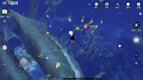 4、再次回到海里,去这四个地方,汐海战碑,古珊瑚广场,古海螺居,幽光鲸落。具体位置下面楼层再发(可以去百度搜汐海拍照地点对照寻找),还是老办法,如果游过去找不到准确位置就打开相机,会出现红色或者绿色的标记,直接游过去,变成绿色之后拍照,再接着靠近就会自动进入剧情,和月镰对话,左边任务栏出现任务时候跟着点就行了。像这样,找不到就打开相机,冲着标记游过去,过去之后靠近拍照点那个小相机就会触发,不用瞎找。