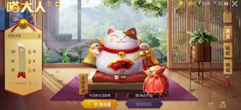 首先进入这个活动,每个人都能免费获得1个【召唤币】,我们直接用这个【召唤币】,在“聚宝”页面聘请1个“喵大人”就行了。你的“喵大人”基础是拥有1000财富值,在“聚宝”页面,我们每存1个【猫元宝】,你的喵大人增加100财富值,每天最多存10次,也就是到达2000财富值。然后在每天的20到24点之间,每100财富值,可领取1个钱袋,钱袋固定开出20服饰币,还有概率开出1个物资币、1个幸运币、1个荣耀勋章。