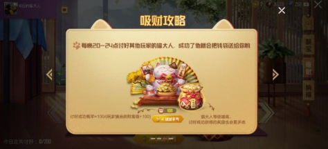 那么下面简单来讲讲进阶的玩法,首先是“吸财”页面,你可以在每天的20到24点,消耗1个【猫元宝】来“讨好”其他玩家的喵大人,有概率获得它所有财富值对应的钱袋。