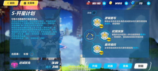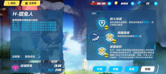 普通攻击:使用微型机枪射击目标,每秒射击一轮,每轮发射3颗子弹,造成3*40%攻击力冰冻元素伤害,每发射一颗子弹回复迷城骇兔1点骇客计数,触发间隔1秒。